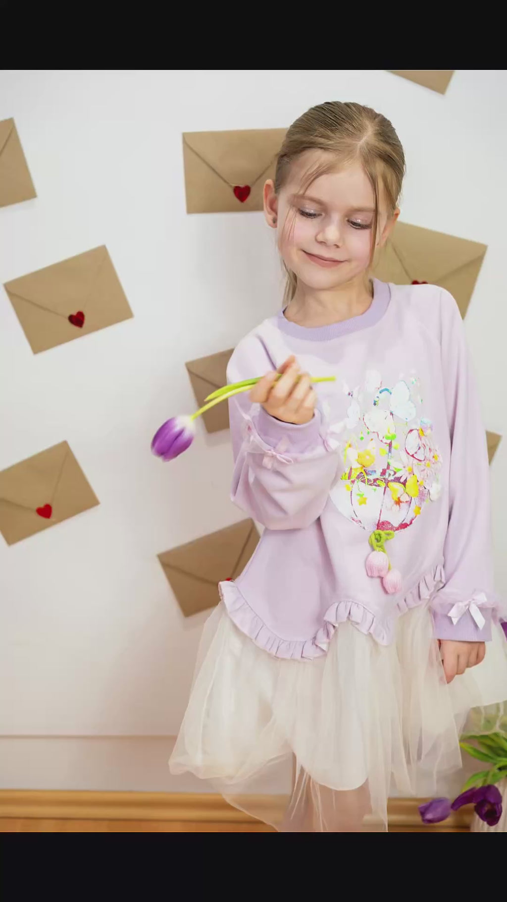 •  Rochie de culoare mov,model deosebit cu maneca lunga, imprimeu cu flori, volanase si  tull alb.